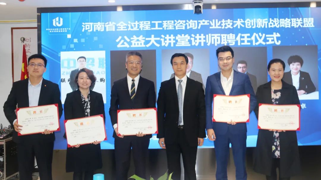 在與會人員的見證下,聯(lián)盟理事長楊明宇為北京市百瑞(鄭州)律師事務(wù)所吳彥、袁武強(qiáng)、閆興偉、秦玉卓律師,中招聯(lián)合信息股份有限公司河南區(qū)域副總經(jīng)理鄭浩頒發(fā)全過程工程咨詢公益大講堂講師聘書。